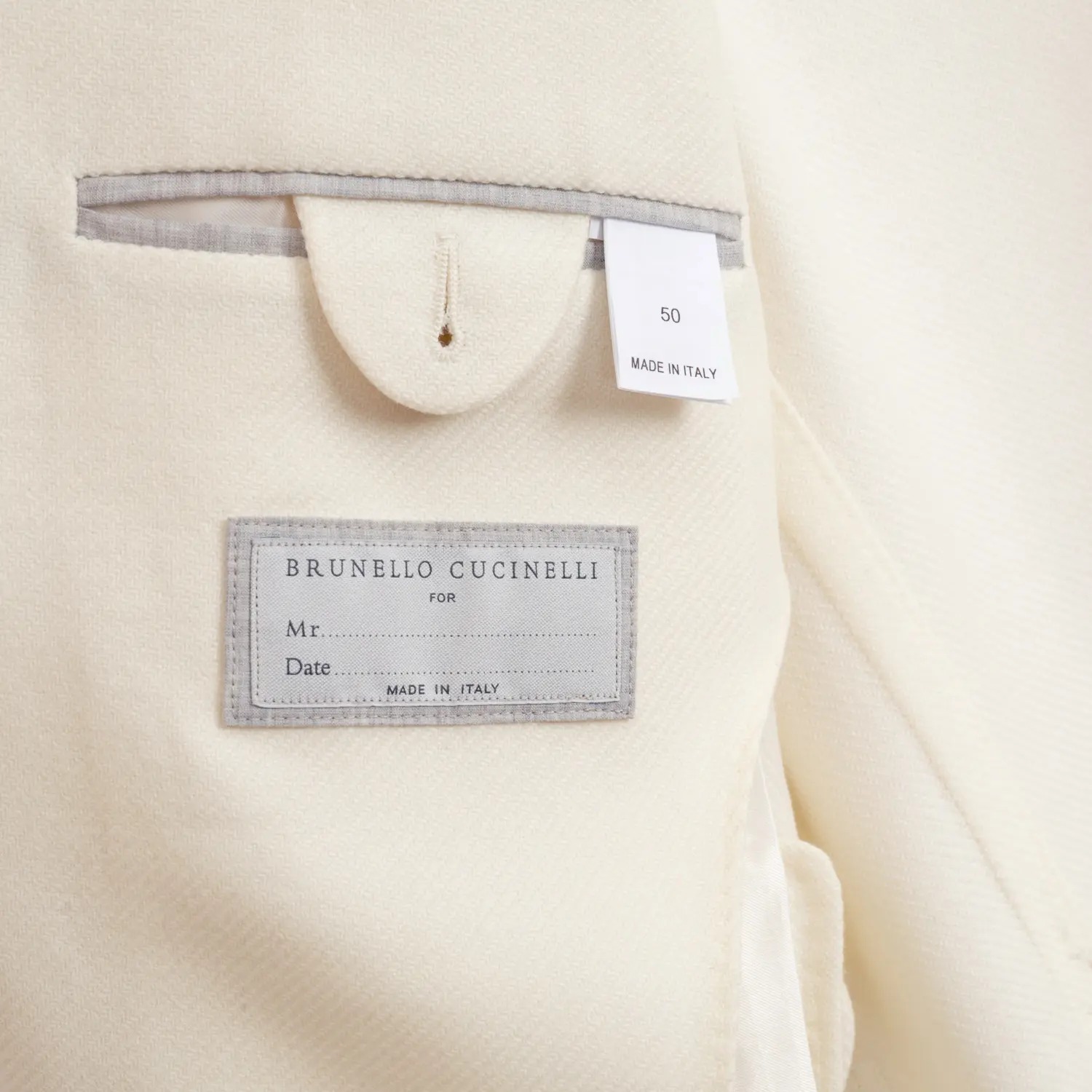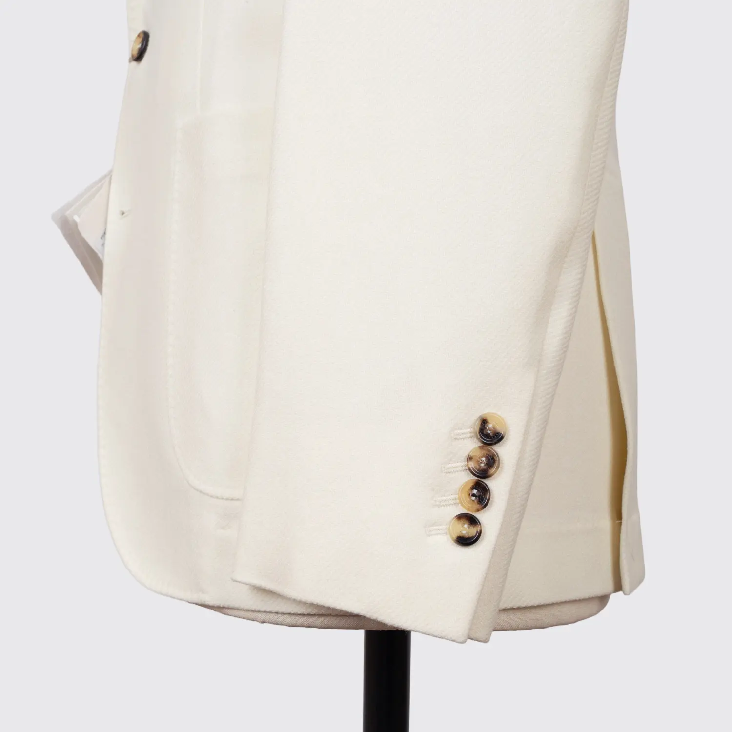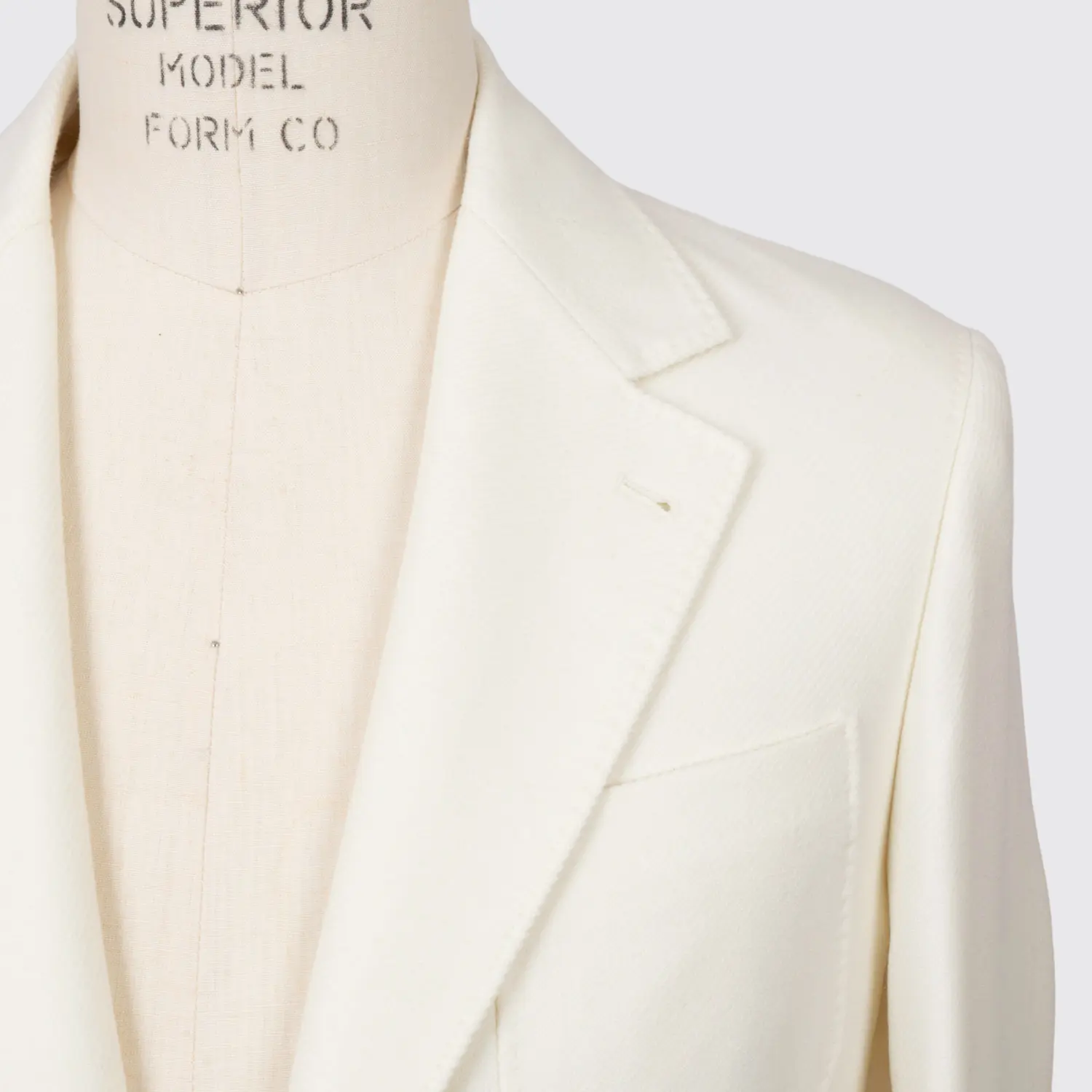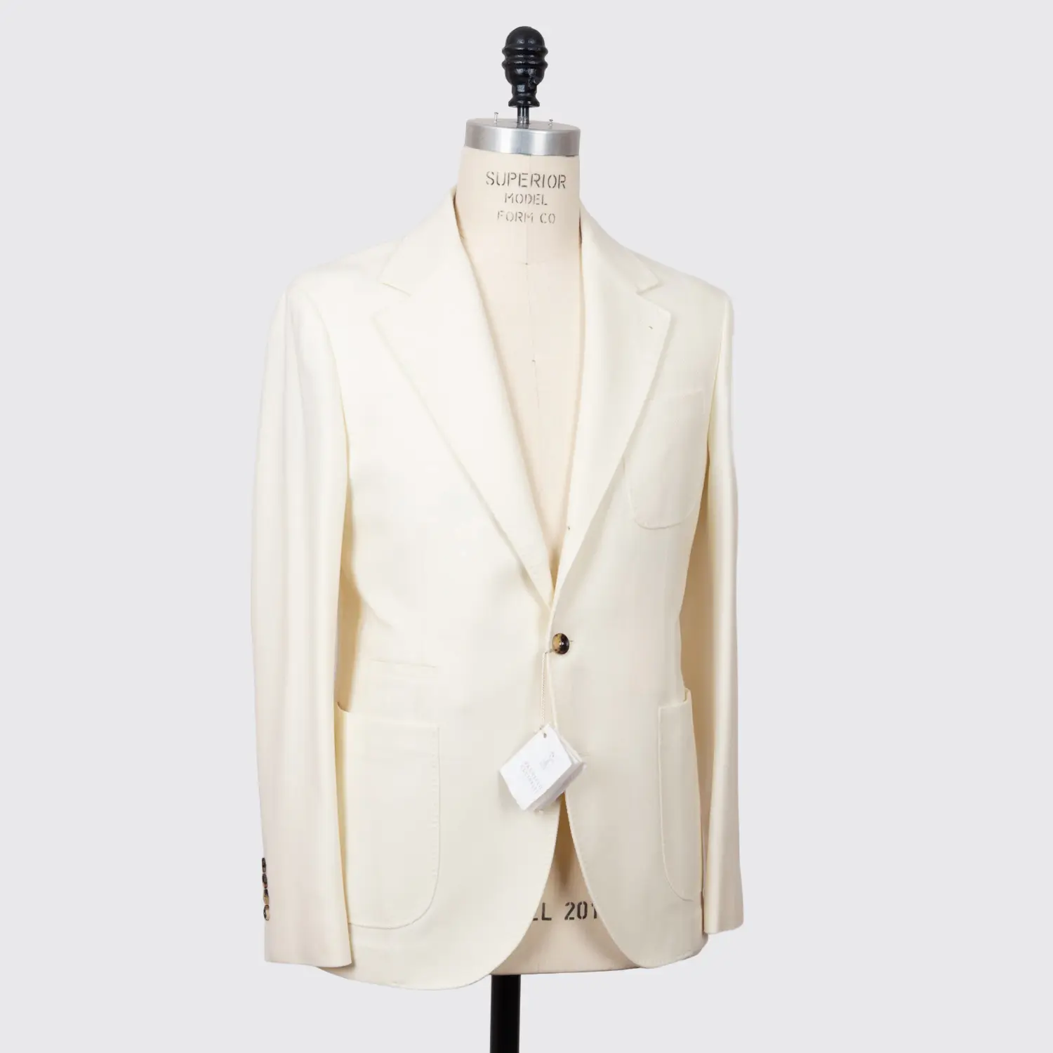 Soft Shoulder, Half Lined, 95% Wool, 3% Cashmere, 2% Silk, Natural Ivory White (Color Code CFD73), Handmade in Italy, Notch Lapel, Double-Vented, Three Button Closure, Est. retail: $4,895.00