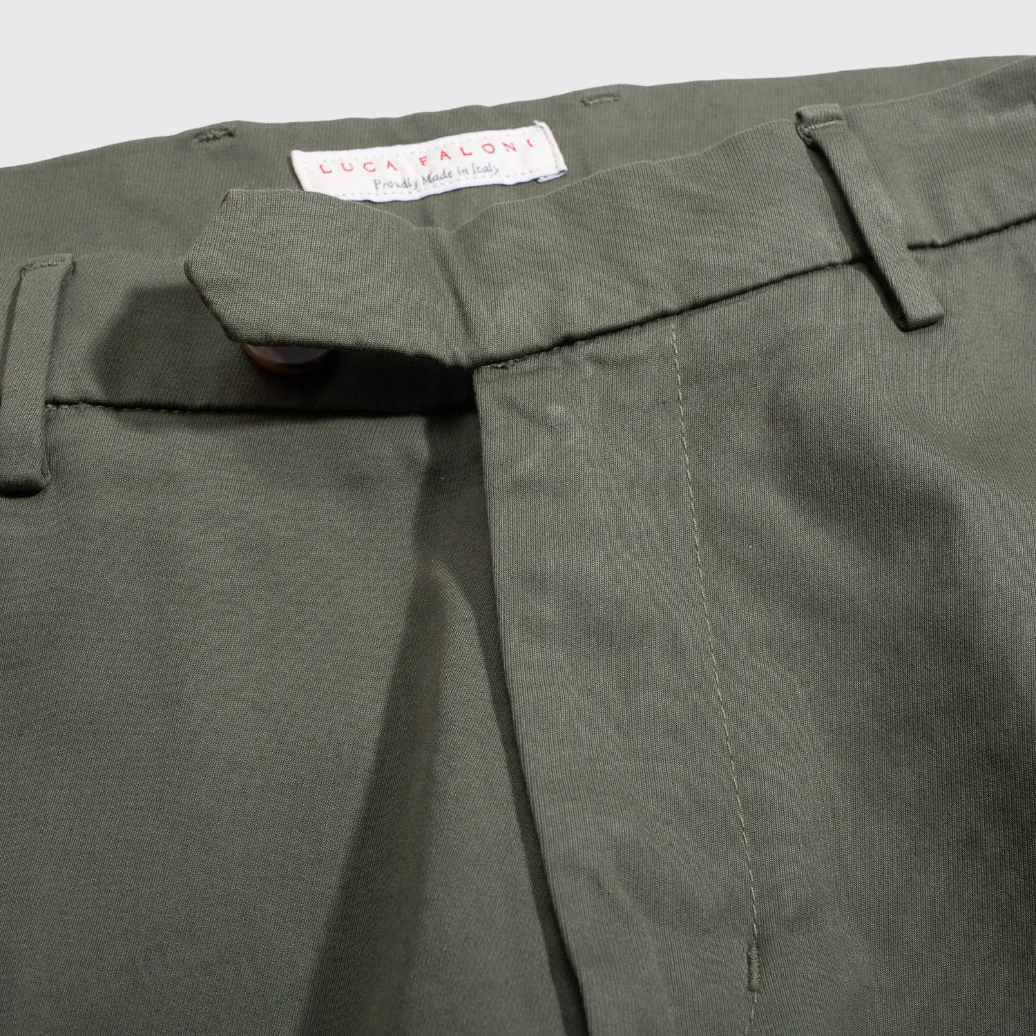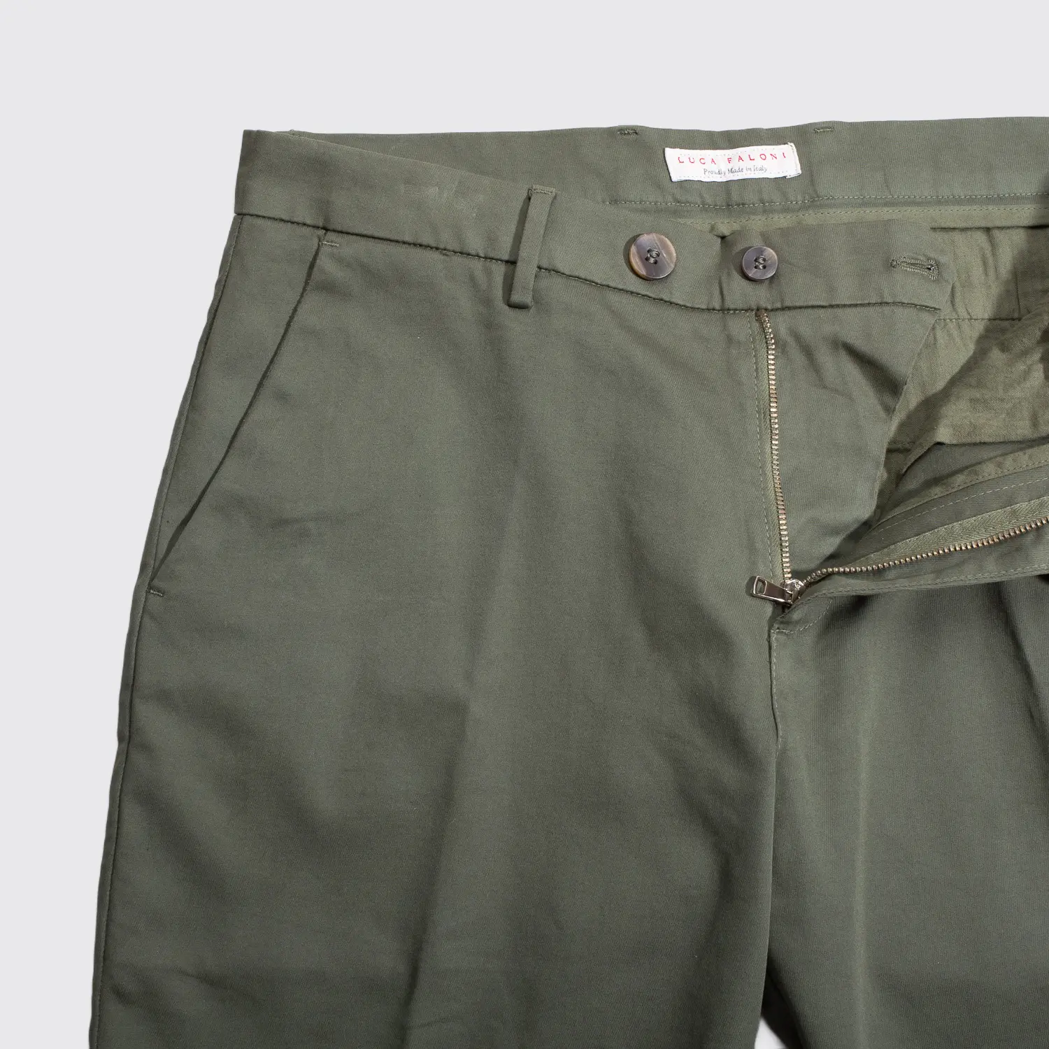 Chino Shorts in Olive, Italian Whipcord Cotton, Triple Horn Concealed Button Closure, Straight Cut, Made in Italy, Est. retail: $175.00
