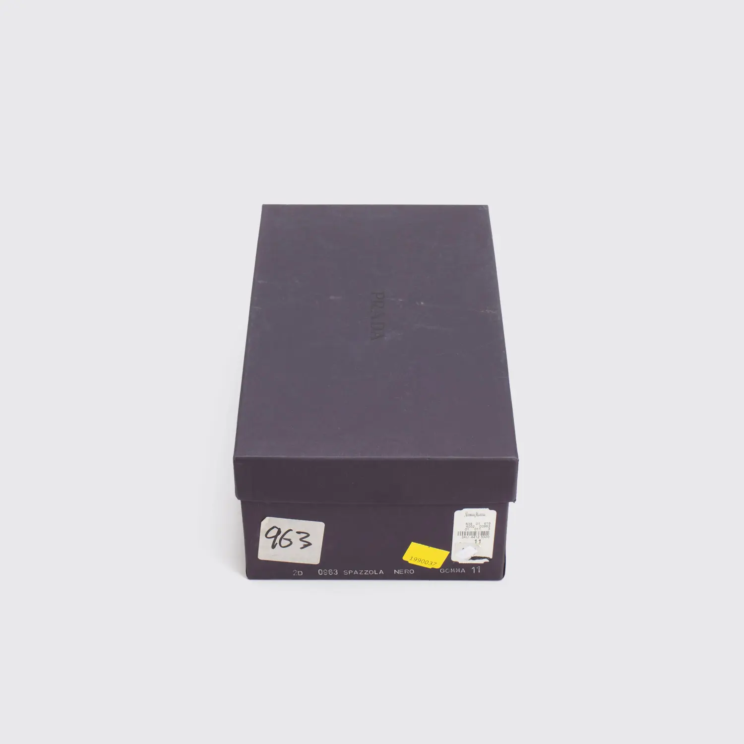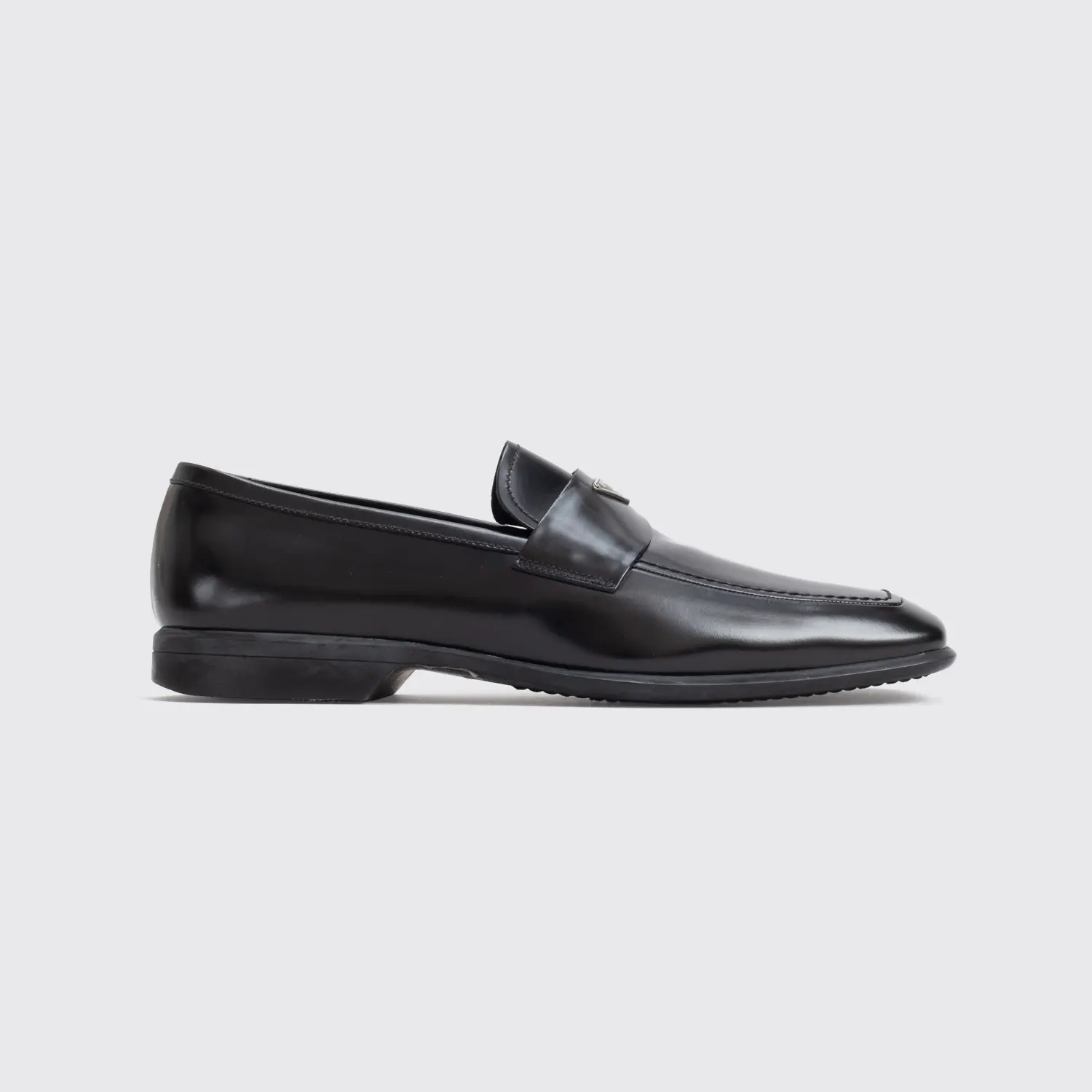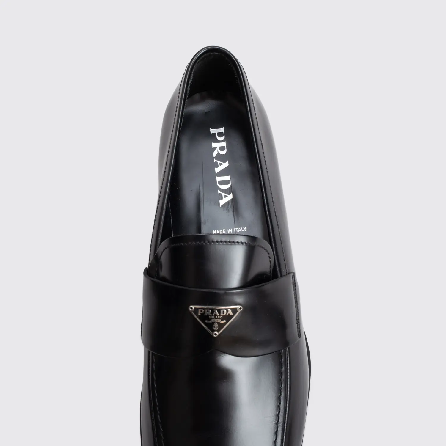Prada Shoes Size UK11 Men Black Leather Triangle Emblem Spazzola Dress Loafer
